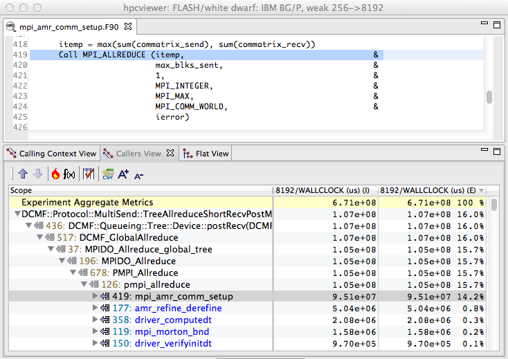 Figure 1.1: A code-centric view of an execution of the University of Chicago’s FLASH code executing on 8192 cores of a Blue Gene/P. This bottom-up view shows that 16% of the execution time was spent in IBM’s DCMF messaging layer. By tracking these costs up the call chain, we can see that most of this time was spent on behalf of calls to pmpi_allreduce on line 419 of amr_comm_setup.#