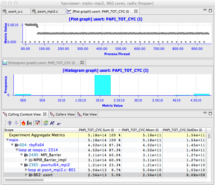 Figure 1.2: A thread-centric view of the performance of a parallel radix sort application executing on 960 cores of a Cray XE6. The bottom pane shows a calling context for usort in the execution. The top pane shows a graph of how much time each thread spent executing calls to usort from the highlighted context. On a Cray XE6, there is one MPI helper thread for each compute node in the system; these helper threads spent no time executing usort. The graph shows that some of the MPI ranks spent twice as much time in usort as others. This happens because the radix sort divides up the work into 1024 buckets. In an execution on 960 cores, 896 cores work on one bucket and 64 cores work on two. The middle pane shows an alternate view of the thread-centric data as a histogram.#