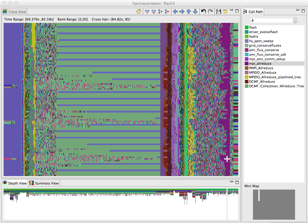 Figure 1.3: A time-centric view of part of an execution of the University of Chicago’s FLASH code on 256 cores of a Blue Gene/P. The figure shows a detail from the end of the initialization phase and part of the first iteration of the solve phase. The largest pane in the figure shows the activity of cores 2–95 in the execution during a time interval ranging from 69.376s–85.58s during the execution. Time lines for threads are arranged from top to bottom and time flows from left to right. The color at any point in time for a thread indicates the procedure that the thread is executing at that time. The right pane shows the full call stack of thread 85 at 84.82s into the execution, corresponding to the selection shown by the white crosshair; the outermost procedure frame of the call stack is shown at the top of the pane and the innermost frame is shown at the bottom. This view highlights that even though FLASH is an SPMD program, the behavior of threads over time can be quite different. The purple region highlighted by the cursor, which represents a call by all processors to mpi_allreduce, shows that the time spent in this call varies across the processors. The variation in time spent waiting in mpi_allreduce is readily explained by an imbalance in the time processes spend a prior prolongation step, shown in yellow. Further left in the figure, one can see differences among ranks executing on different cores in each node as they await the completion of an mpi_allreduce. A rank executing on one core of each node waits in DCMF_Messager_advance (which appears as blue stripes) while ranks executing on other cores in each node wait in a helper function (shown in green). In this phase, ranks await the delayed arrival of a few of their peers who have extra work to do inside simulation_initblock before they call mpi_allreduce.#
